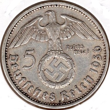 Jager 0367 - 5 Reichsmark 1936 E Hindenburg Swastika Silver Coin