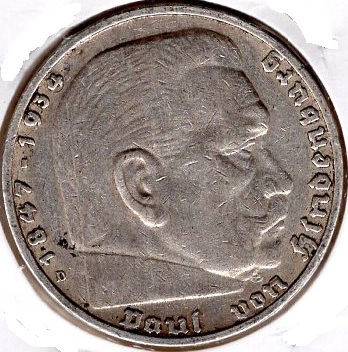 Jager 0367 - 5 Reichsmark 1937 D Hindenburg Swastika Silver Coin