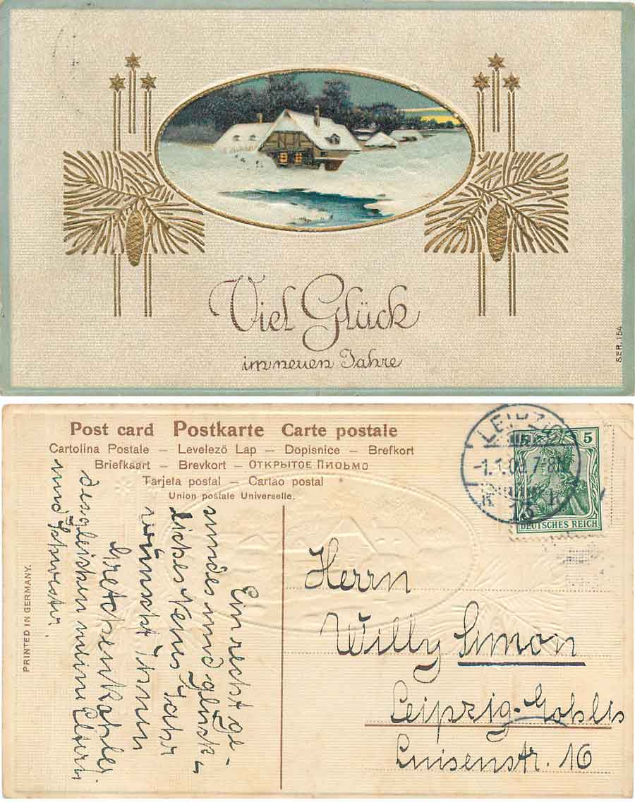 New Year Art Nouveau embossed gold-edged card o 1.1.1909