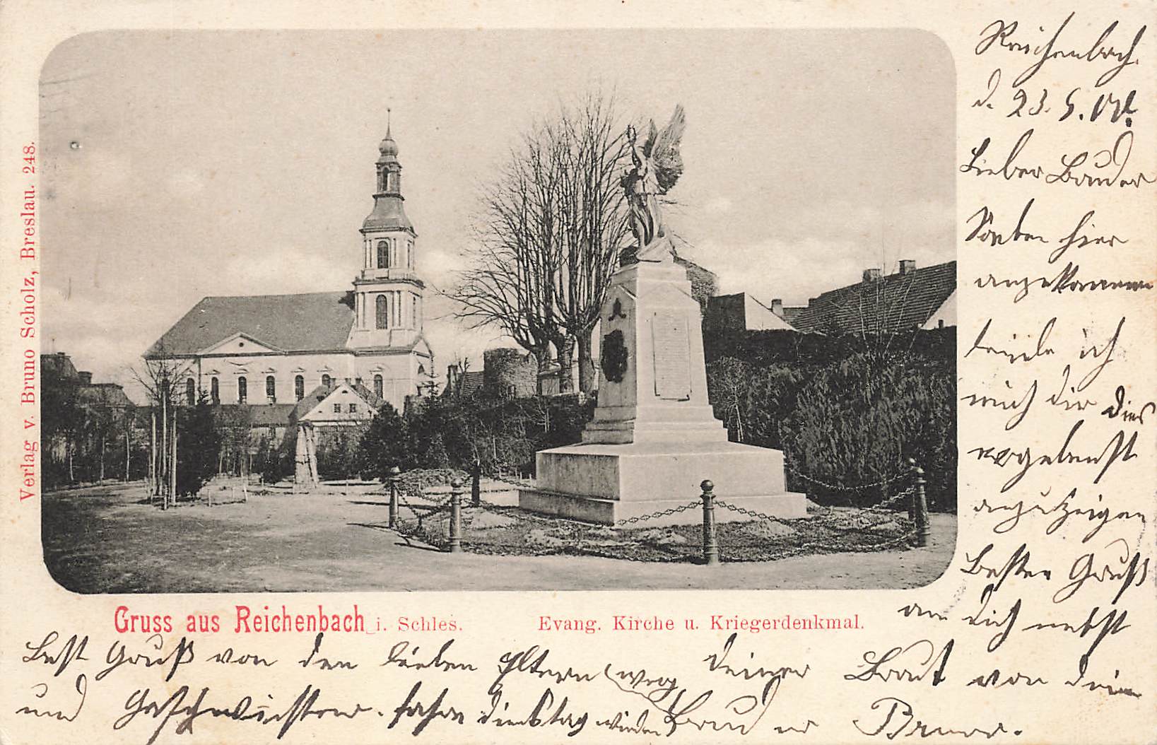 Reichenbach Eulengebirge Evangelical Church with War Memorial Silesia Dzierżoniów Lithograph circa 1900