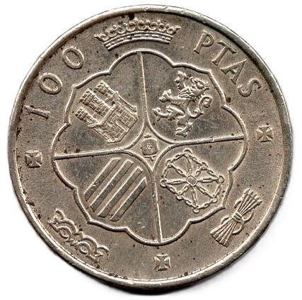 Spain 100 Pesetas 1966 Francisco Franco Catalog number: KM 797 Material: Silver Weight: 18.93 g Fineness: 800‰ (fine weight 15.14 g) Diameter: 34.00 mm