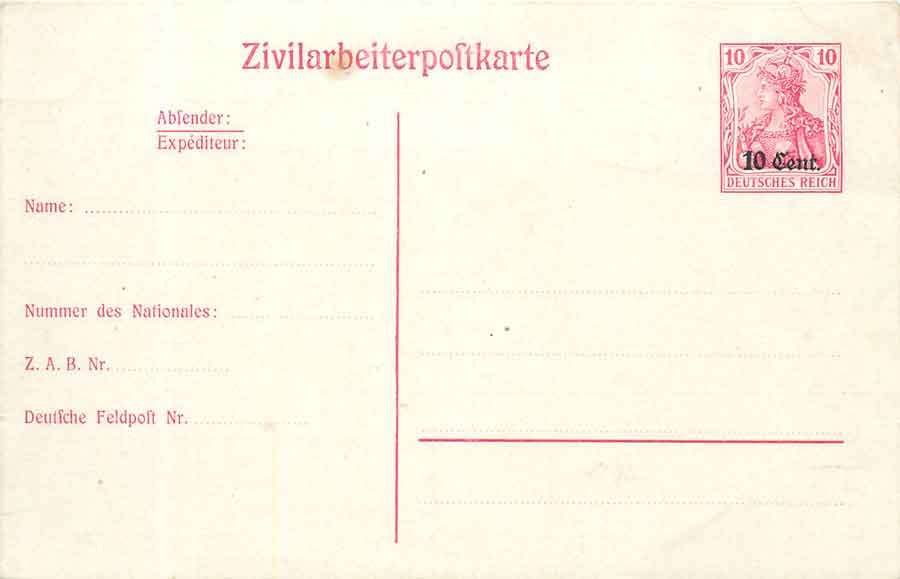 Stage area West civilian worker postcard postal stationery 10 cents. on 10 Pfennig Germania