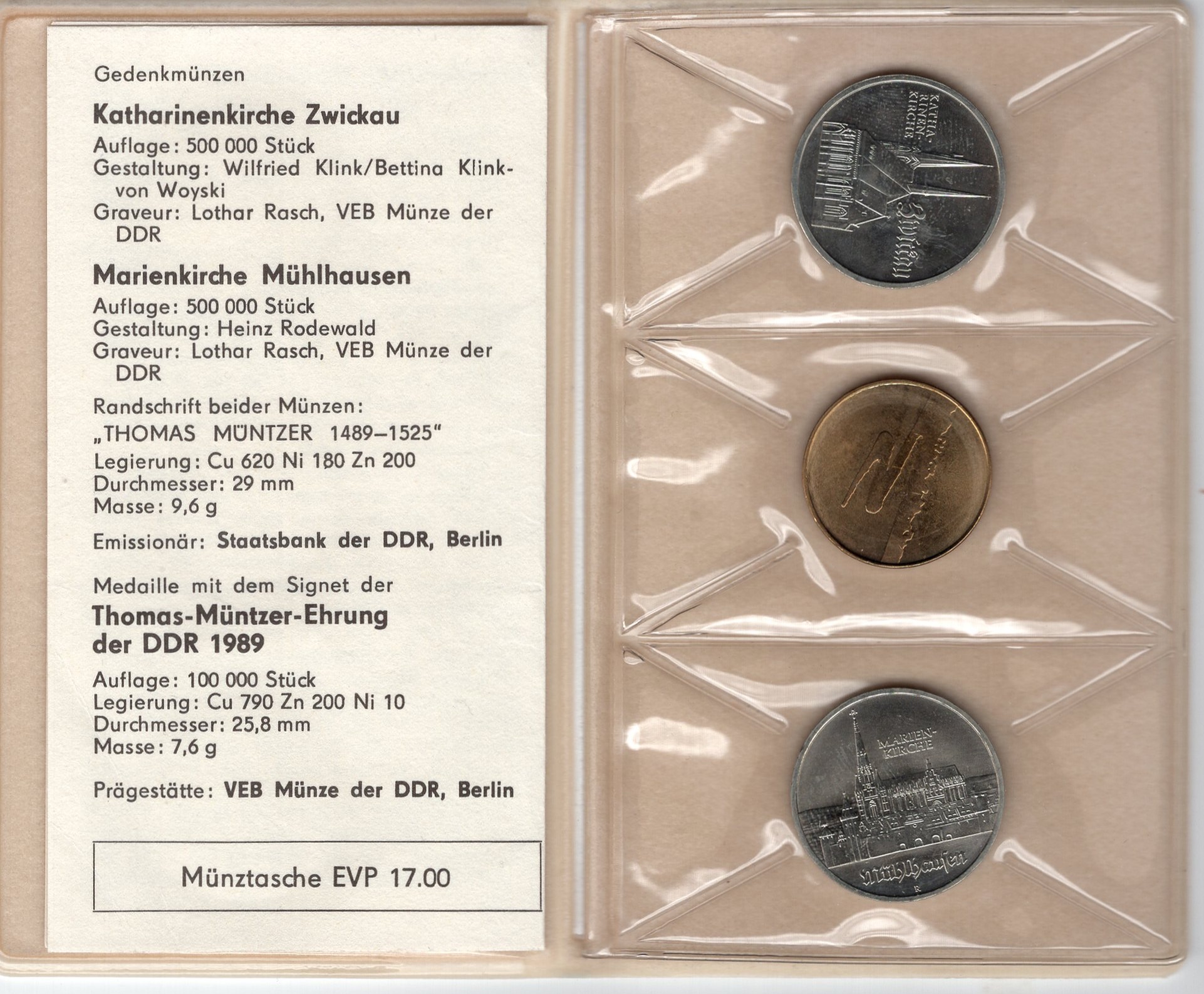 Thomas Müntzer Commemoration GDR Commemorative Set 2 x 5 Mark with Medal 1989 St. Mary's Church Mühlhausen - Zwickau Uncirculated in original folder